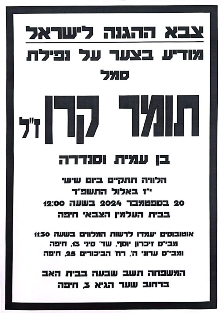 הלווייתו של סמל קרן תתקיים מחר (שישי) בשעה 12:00 בבית העלמין הצבאי בחיפה. אוטובוסים יעמדו לרשות המלווים בשעה 11:30 מביה"ס זיכרון יוסף ומביה"ס עירוני ה'.