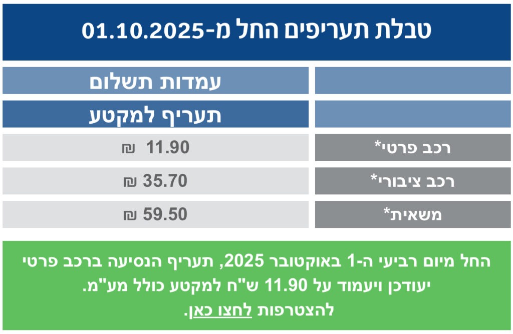 תעריף הנסיעה למקטע לרכב ציבורי – מנוי ושאינו מנוי – יהיה 35.70 שקל (במקום 35.22 שקל), ולמשאית – מנויה ושאינה מנויה – תעריף הנסיעה למקטע יעלה ל-59.50 שקל (במקום 58.70 שקל).