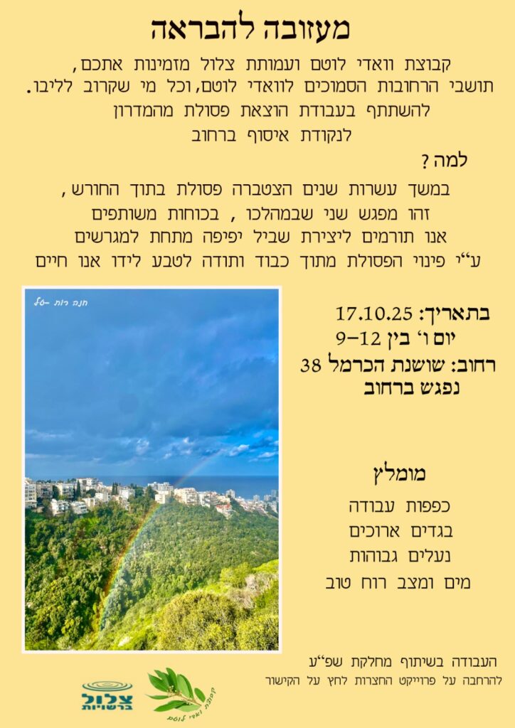 מחר (שישי), יתקבצו החל מ-9:00 מתנדבים ושכנים ברחוב שושנת הכרמל 38, שם תחל יוזמה קהילתית-עירונית בשיתוף קבוצת ואדי לוטם, עמותת צלול ואגף שפ"ע (שיפור פני עיר) בעיריית חיפה שבמהלכה יפנו המתנדבים פסולת שהצטברה בתוך החורש במשך חודשים, על מנת ליצור שביל הליכה נעים ופסטורלי.