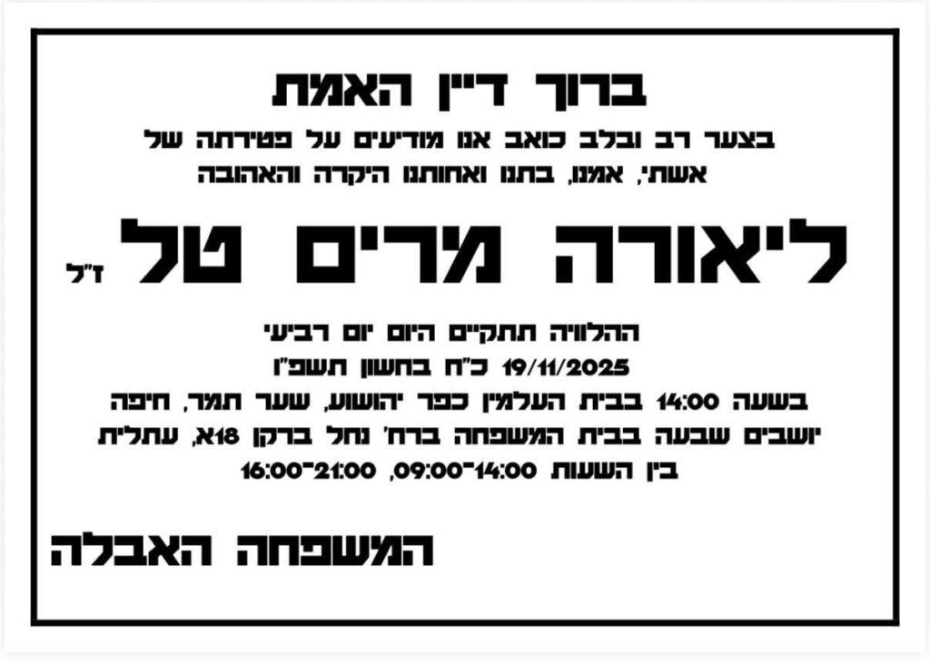 הלוויתה של ליאורה טל ז״ל תתקיים היום (רביעי), בשעה 14:00 בשער תמר, בית העלמין שדה יהושע, חיפה.