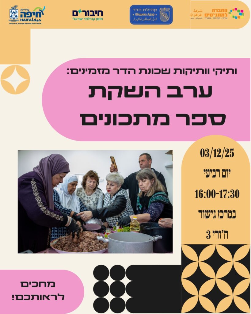 יש רגעים קטנים שמסבירים שכונה שלמה. ערב אחד של שולחנות ארוכים בחצר צבעונית, נשים מבוגרות שמקפידות להעביר צלחות מיד ליד, ריחות של מקלובה וקובה באוויר, ושיחות שמתנהלות למרות פערי השפה, או אולי בזכותם. זה בדיוק מה שמבקשות קבוצות הוותיקות של הדר לחגוג בשבוע הבא, כשהן ישיקו את ספר המתכונים הקהילתי שלהן. פרויקט שנולד מתוך שנה של מפגשים, טיולים, התנדבות ובעיקר, חיבורים אנושיים.