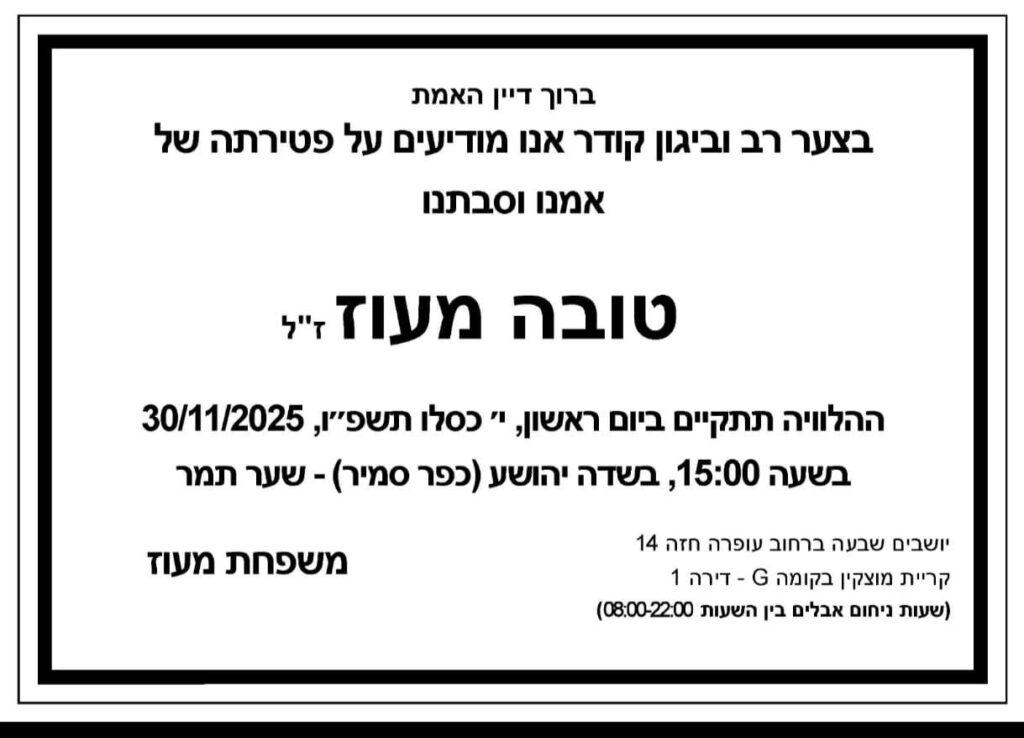 הלווייתה של טובה מעוז ז"ל תתקיים מחר, יום ראשון, בשעה 15:00, בבית העלמין שדה יהושע (כפר סמיר) בשער תומר. המשפחה תשב שבעה ברחוב עופרה חזה 14 בקריית מוצקין, קומה G דירה מס' 1. שעות ניחום אבלים בין השעות 08:00 ל-22:00.