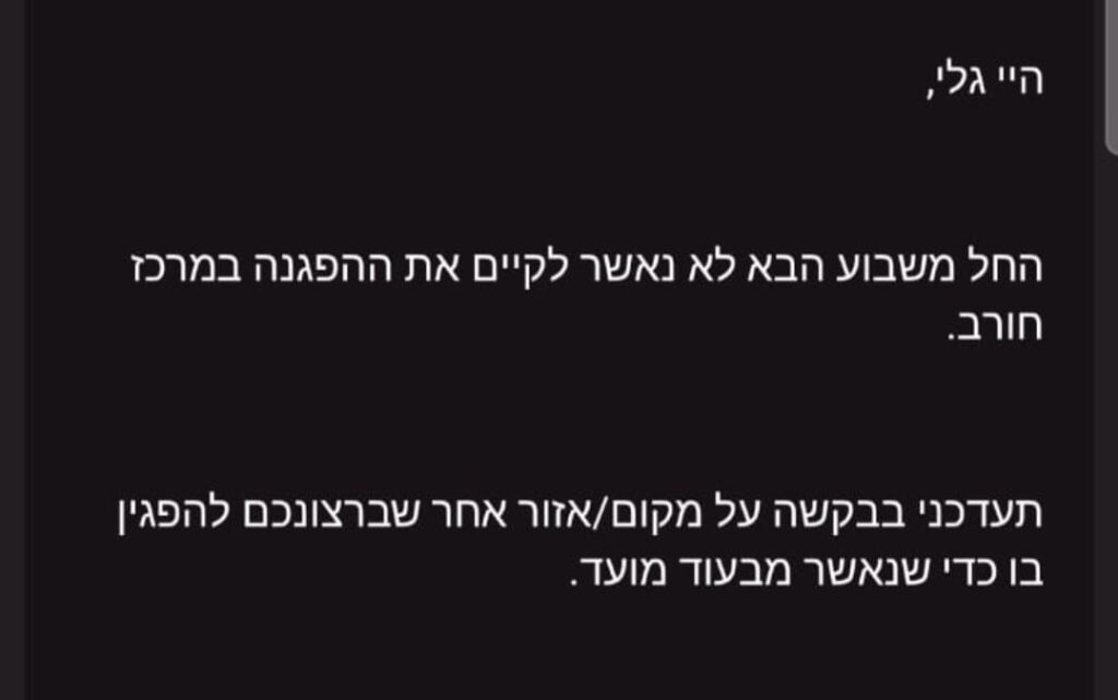 הודעה לקונית אחת, בת שורה אחת בלבד, נחתה השבוע אצל גלי עשת בזק, דוברת מחאת העם חיפה וממארגניה, בה נאמר: "החל משבוע הבא לא נאשר לקיים את ההפגנה במרכז חורב. תעדכני בבקשה על מקום/אזור אחר שברצונכם להפגין בו".