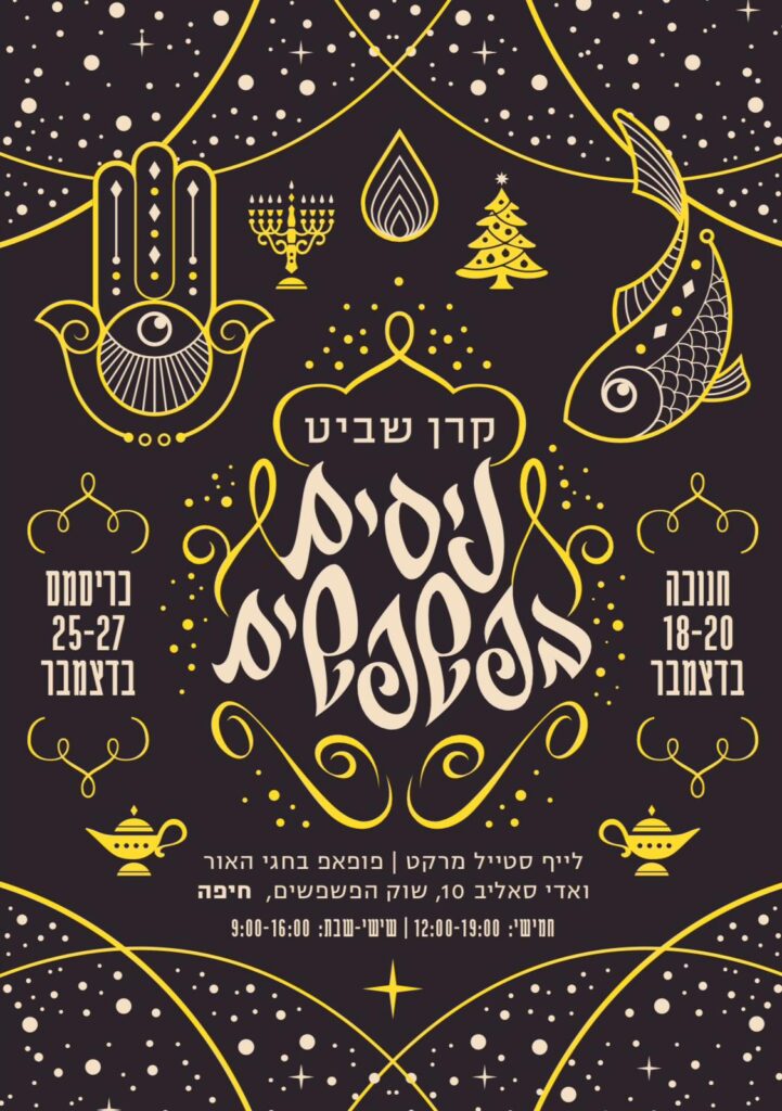 "ניסים בפשפשים – לייף סטייל מרקט חגיגי", שוק הפשפשים חיפה, מתחם הרובע, ואדי סאליב. סופ״ש חנוכה, 20-18 בדצמבר; סופ״ש כריסמס, 27-25 בדצמבר. חמישי 19:00-12:00, שישי שבת 16:00-9:00. הכניסה חופשית, האירוע יתקיים בכל מזג אוויר.