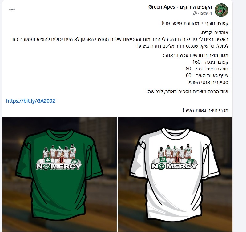 אלא שבימים האחרונים הפרשה לא שככה, אלא קיבלה תפנית נוספת. ארגון הקופים הירוקים הוציא למכירה מרצ'נדייס עם הדימוי המרכזי מהשלט ולפי תגובות האוהדים, אלפי פריטים נמכרו בתוך זמן קצר. עבור מתנגדי המהלך, כבר לא מדובר בטעות חד־פעמית ביציע, אלא בהפיכת מסר פוגעני למוצר מסחרי ובאקט מודע של התרסה.