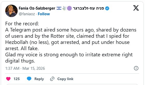 מאוחר יותר התייחסה גם פרופ' עוז-זלצברגר עצמה לנושא בציוץ ברשת X (לשעבר טוויטר) בעברית ובאנגלית. "הערב עלה פוסט בטלגרם, ואף צוטט באתר רוטר, על פיו ריגלתי למען החיזבאלה, נעצרתי, ואני במעצר בית. לא היו דברים מעולם", הבהירה והוסיפה: "התראה לפני תביעה תישלח לכל מי שיפרסם את השקר. אני שמחה שקולי חזק דיו להרגיז את מכונת הרעל. אמשיך להשמיע אותו".