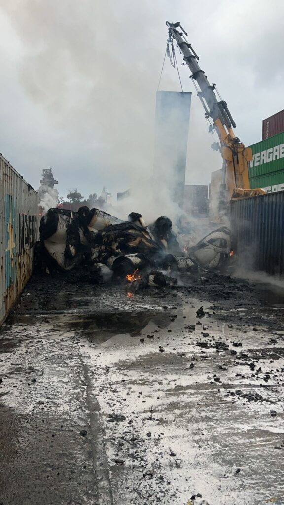 "אנו פועלים עם מנופים כבדים, המרימים את המכולות ושופכים את התכולה שעדיין בוערת החוצה, וצוותי כיבוי אש פועלים המקום", אומר מונוביץ. עוד מציין מונוביץ כי הבוקר התקיימה במסוף, הערכה של הנזק הנאמד במעל 6 מיליון שקלים.