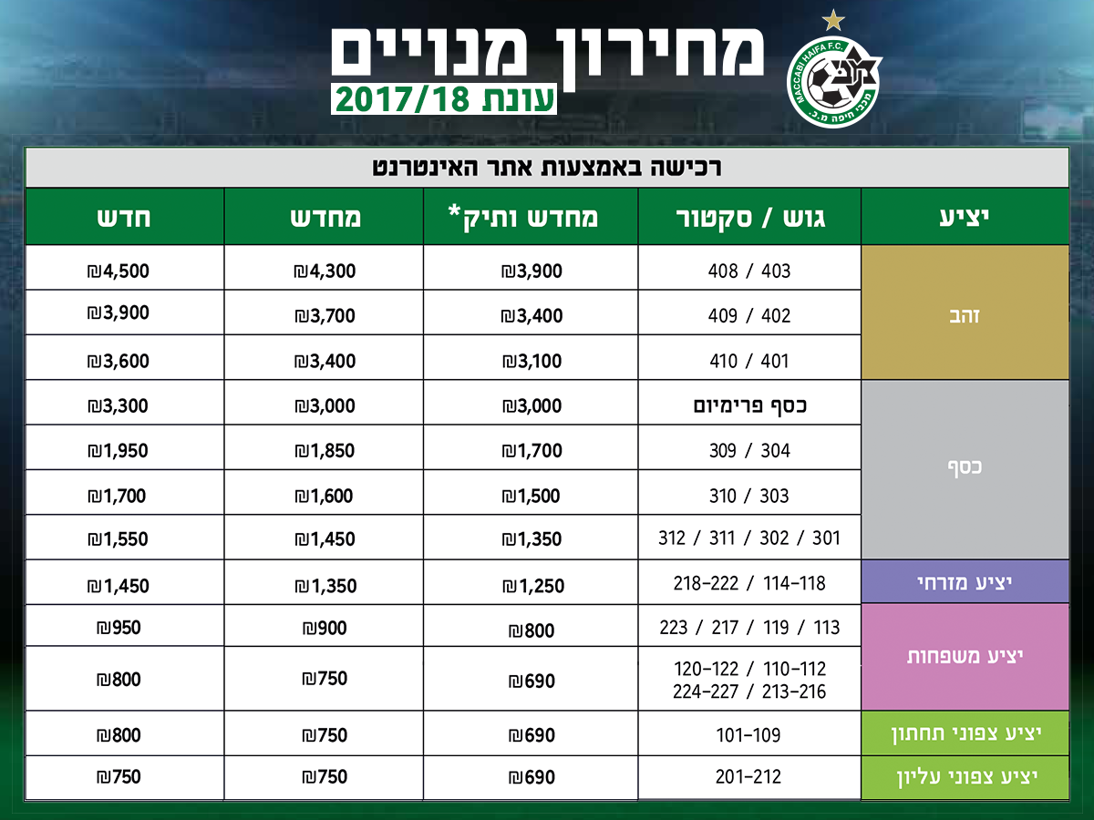 שימו לב, בשלב זה מועדוני הזהב והיהלום מלאים. כדי להיכנס לרשימת ההמתנה ניתן לפנות לגברת נורית שרון בטלפון שמספרו: 04-8346626 או במיל [email protected] לחילופין ניתן גם להירשם דרך משרד הכרטיסים בטלפון 04-7704444.